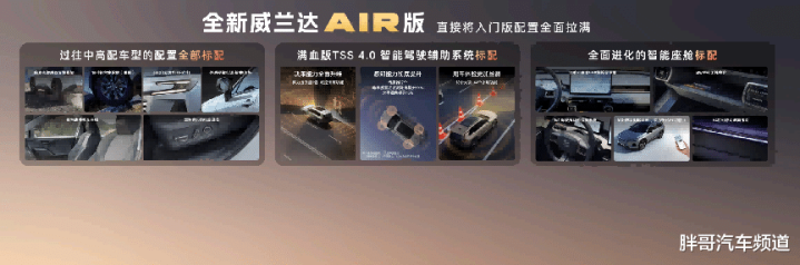 更打破行业惯例的是,全新换代威兰达AIR版不以“低价=低配”为潜规则,反而做到了“入门配置拉满”。以往中高配车型专属的真皮方向盘、高级皮质座椅、外后视镜折叠加热、50W无线快充、64色氛围灯等舒适配置,以及全面进化的智能座舱和油车里最好用的L2级丰田TSS 4.0智能驾驶系统,均是标配。这意味着用户无需在预算和心仪配置之间艰难抉择,一步到位即可享受全方位的满配与科技体验,彻底告别“套路式选装”。