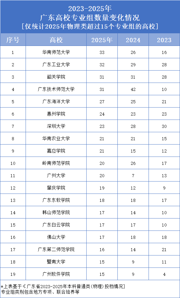 柯大侠整理了2023-2025年广东高校专业组(物理)的数据发现,2025年有19所高校的专业组数量在15个以上,华南师范大学便是其中专业组数量最多的院校对对配,这些高校值得考生关注。结合近3年的数据观察发现,如暨南大学、广州大学等院校,专业组持续“瘦身”。