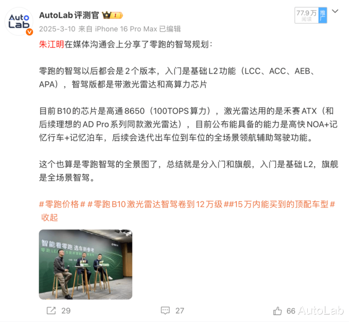 就比如零跑B10激光雷达版,它虽然有激光雷达,但目前只支持高速领航、通勤领航等功能,真正的城区领航或者车位到车位还需要等后续的OTA。