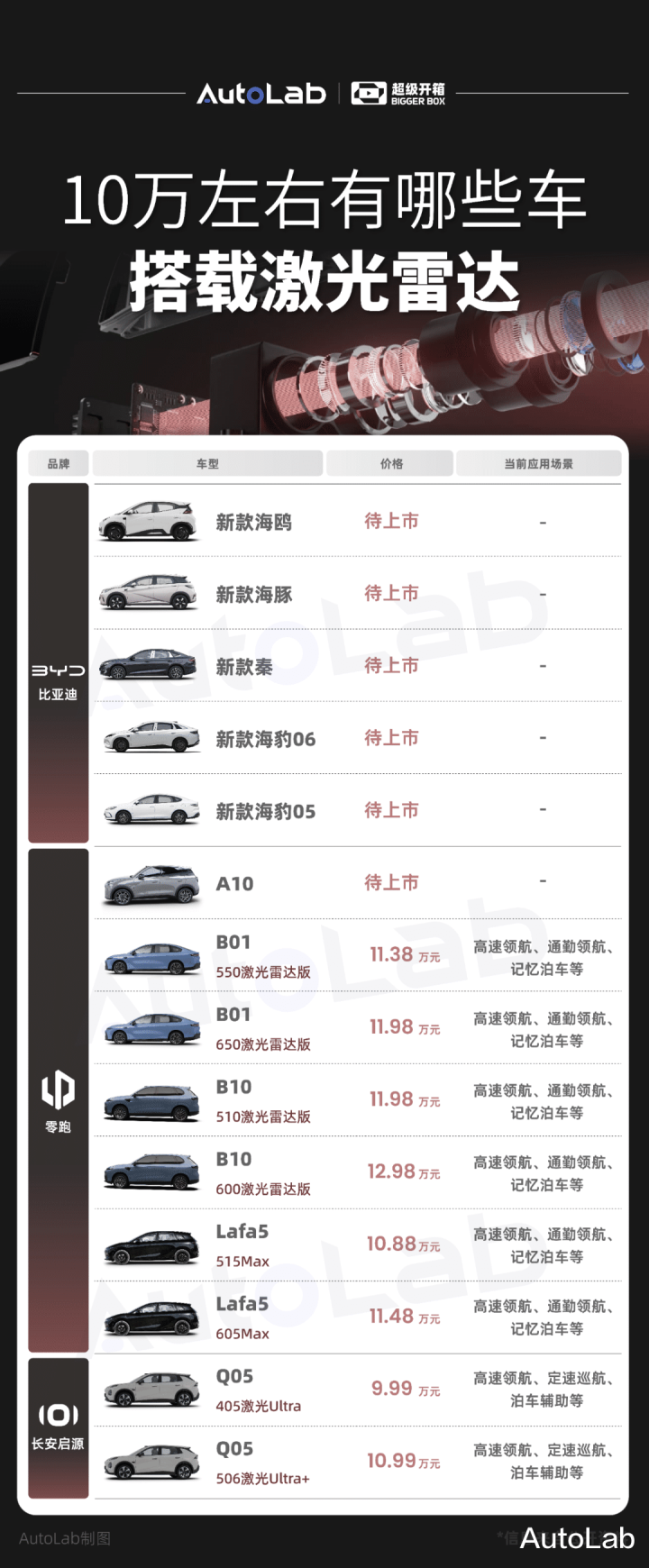 与此同时,包括小车在内,我们也整理了价格在10万左右并搭载激光雷达的车型,希望能给大家在看车、购车时提供参考。