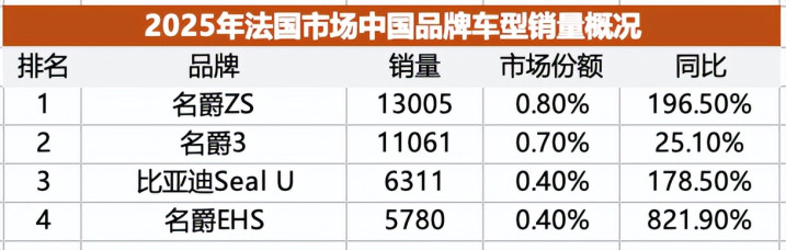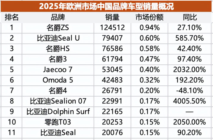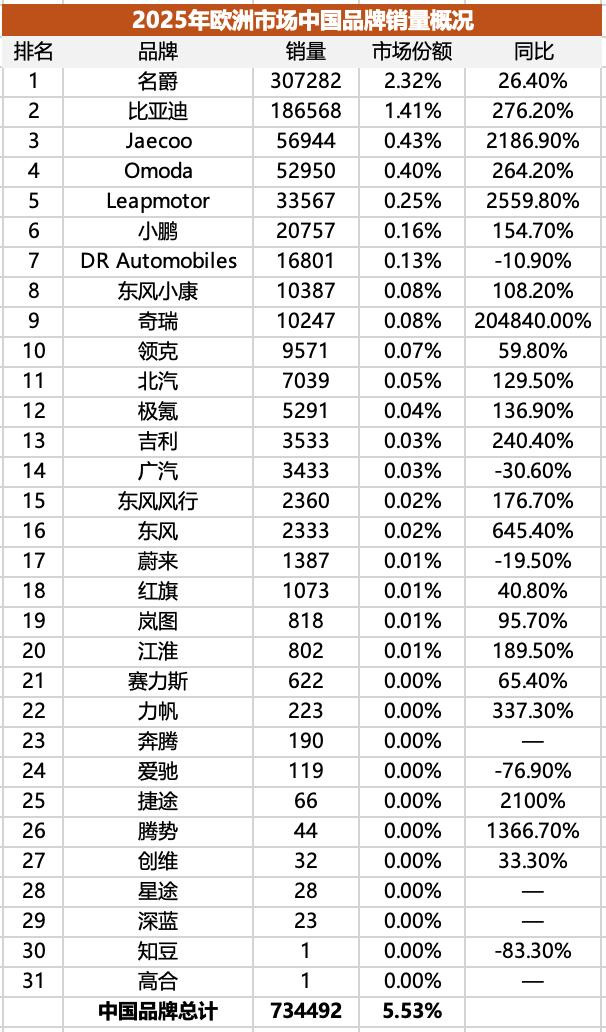 在如此繁重的税率之下,中国品牌2025年在欧洲市场的总体销量达到73.4万辆,占据5.5%的市场份额,且在榜的绝大多数品牌,都实现了两位数、三位数甚至四位数的同比增幅。