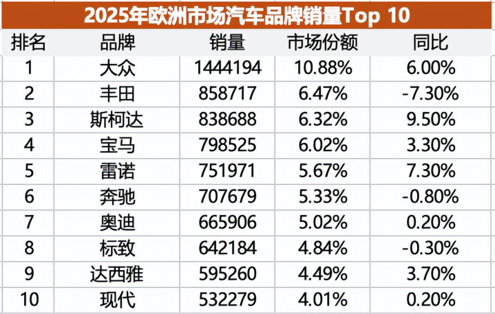 欧洲市场销量最高的10个品牌中,有8个都是欧洲本土品牌,唯二挤入前十的外来品牌分别是排名第二的丰田和排名第十的现代。