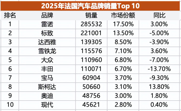 2025年法国新车总销量163.2万辆,是欧洲第三大市场,同比下滑了5%,是50年以来最低水平。