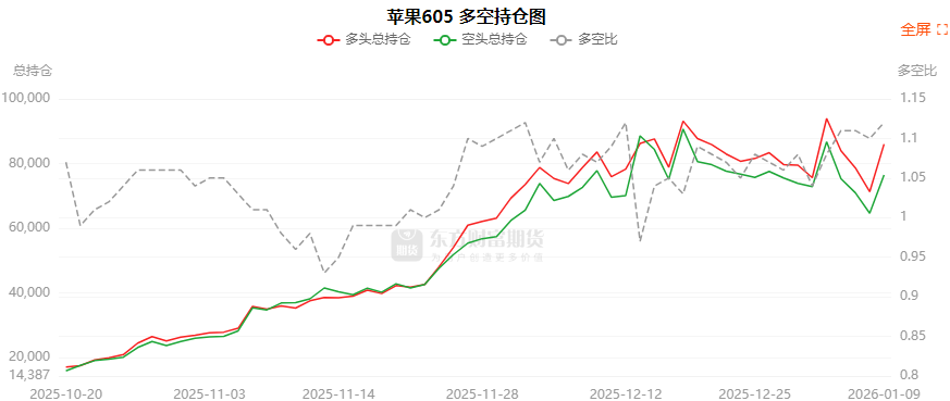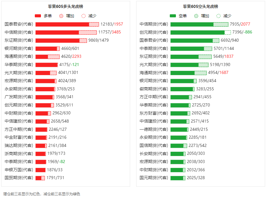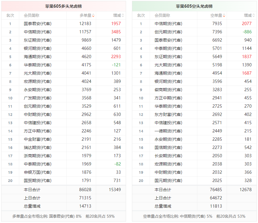 总体而言,苹果605合约今日增仓上行,多空持仓排名前20席中,多空双方均呈进场态势,多头进场意愿强于空头。
